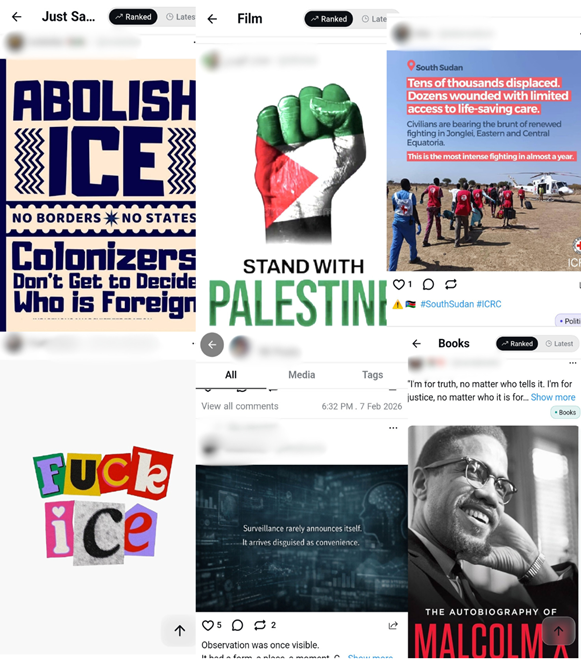 Second, periods of mass digital migration can distort content visibility. When large volumes of users enter a platform simultaneously, systems are forced to adapt to incomplete behavioural data. In early-stage and rapid growth phases, mechanisms may prioritise user retention through increased volume of heterogeneous content, increasing the likelihood that ideologically divergent material appears in proximity. UpScrolled is uniquely vulnerable to this as the algorithm driving the platform’s ‘discover’ feed orders posts by engagement in conjunction with light temporal manipulation, providing a more equal opportunity to all content, be it legitimate discourse or not, to appear on a user’s feed.