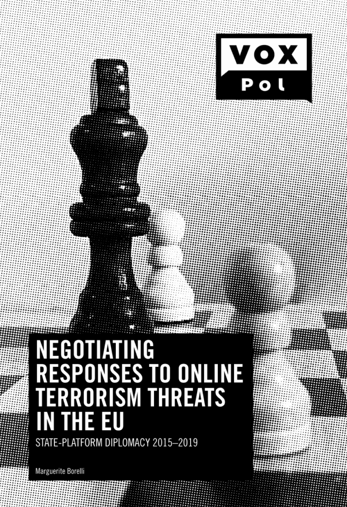 You are invited to the launch of a new VOX-Pol report, ‘Negotiating Responses to Online Terrorism Threats in the EU: State-Platform Diplomacy 2015 – 2019’, written by Marguerite Borelli. This takes place online on Monday 17 November 14:00 to 15:00 UK time (15:00 to 16:00 CET).
