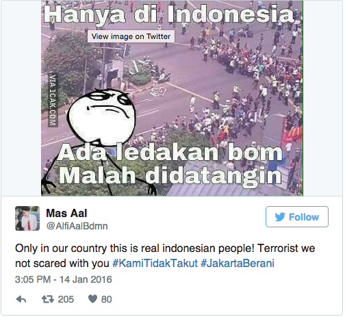 The hashtag #KamiTidakTakut, which has been used by more than 100,000 people a day since the attack, has a tone of defiance against terrorism. We can see this in comments and memes using the hashtag.