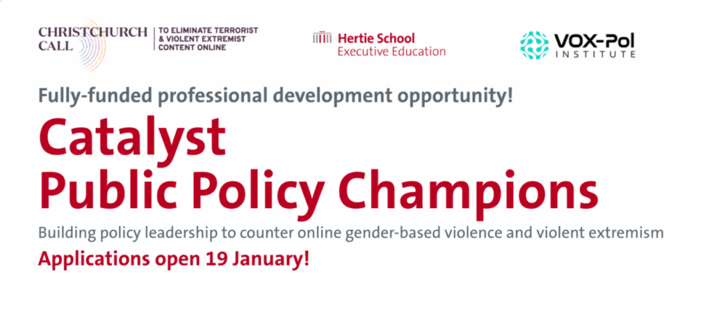 | The Catalyst Public Policy Champions Programme is an intensive, international fully-funded executive-style training programme designed to strengthen policy responses to the growing links between online gender-based violence and violent extremism. Led by the Christchurch Call Foundation, and delivered by the Hertie School in partnership with the VOX-Pol Institute, the programme equips policymakers and practitioners with the evidence, skills, and cross-sectoral networks needed to design and implement effective, context-sensitive responses to hybrid online harms, terrorism, and radicalisation dynamics. Applications close on 20 February. For details of how to apply, visit the Hertie School’s website. |