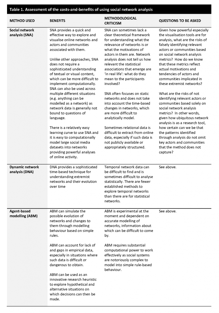 The methodological criticisms raised have argued that these methods often lack a coherent theoretical framework to explain what the often glitzy network visualisations and sophisticated statistical metrics mean. Network analysis excels in more exploratory or descriptive research but it does not always provide a deeper theoretically-grounded understanding of the contextual factors that inform the network dynamics or the actors and communities implicated in them. Focusing only on the network and community metrics can thus risk neglecting complex questions of agency and motivation obviated from the abstract network data. Also, critics have argued that a large portion of the network models used in extremism research have so far been static and thus do not sufficiently take into account constant processes of transformation and change in human networks.